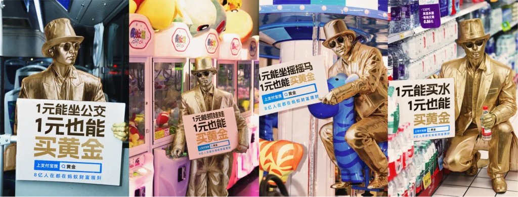 Ant Fortune also launched a playful offline campaign featuring a “Gold Man” dressed in head-to-toe gold, holding a price sign and appearing in places like convenience stores, amusement parks, and shopping malls. The character used relatable comparisons to highlight how affordable the “1 RMB” gold shop is: “1 RMB buys a bus ride. 1 RMB also buys gold.” or “1 RMB buys a bottle of water. 1 RMB also buys gold.”