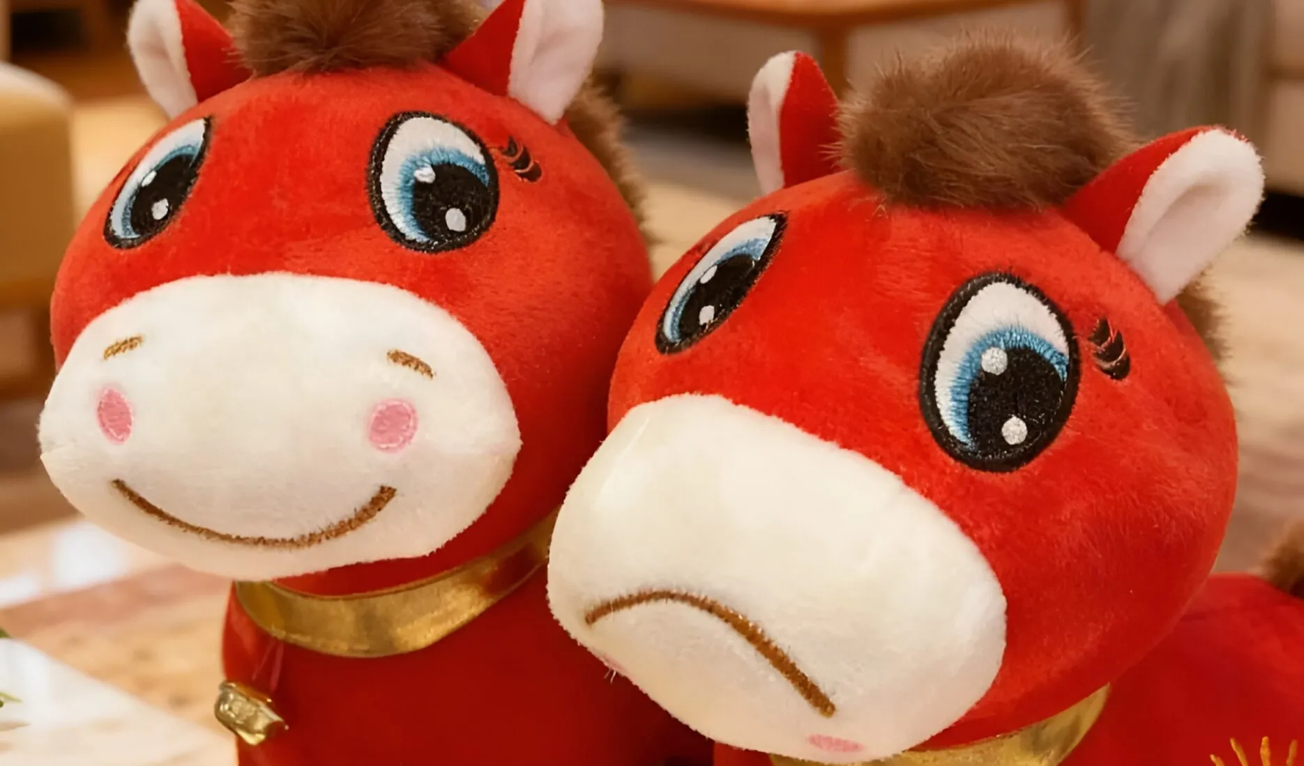 The toy, a 20cm lucky horse selling for around RMB 25 (about US $4) was designed to do what New Years merch always does – signal prosperity. It comes embroidered with a gold blessing for wealth, and red fur meant to bring festive cheer. But a sewing error flipped the facial expression, pulling the mouth and nostrils downward, and turning the intended smile into a full-on sob. Instead of killing the product, the mistake gave it personality.