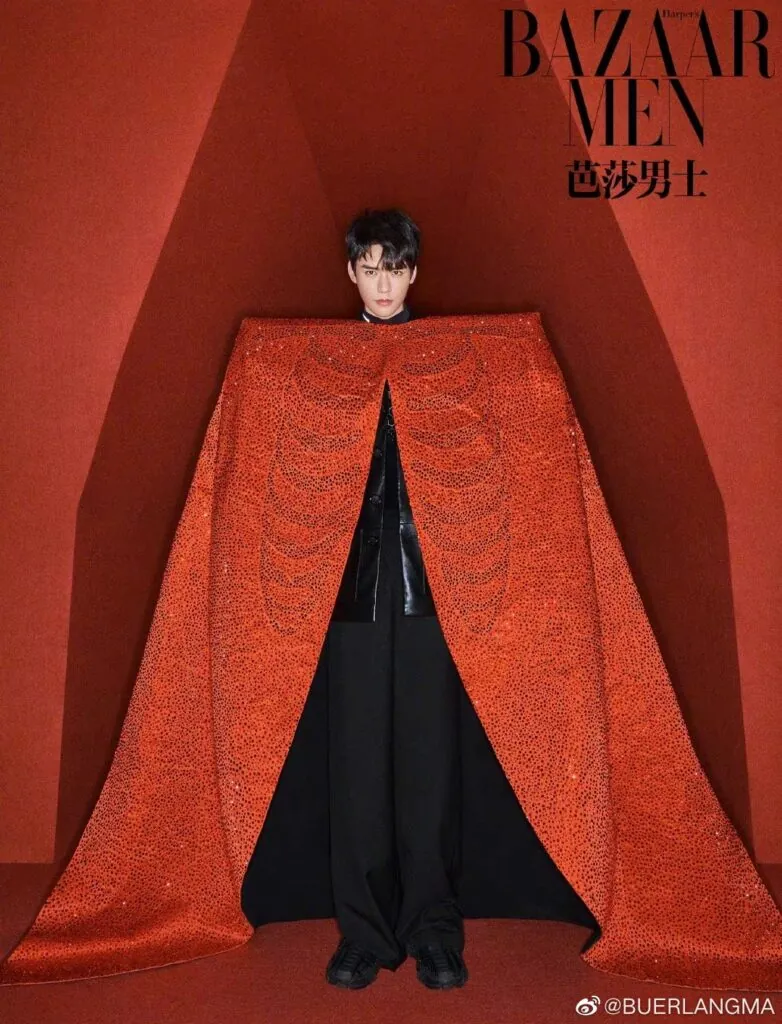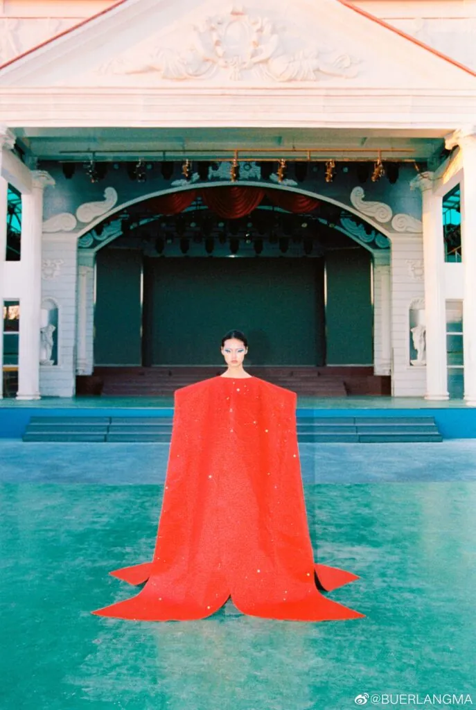 The oversized garment designed by the 21-year-old, who is the creative director at a local designer brand BUERLANGMA (rebranded from RYZYORYUAN), is also one of the brand’s signature designs. The cloak draws inspiration from the shape of the traditional shawl worn by the Yi people, one of China’s ethnic minorities in southwest China, identifiable by an exaggerated contour that is enhanced by its bright red colour.