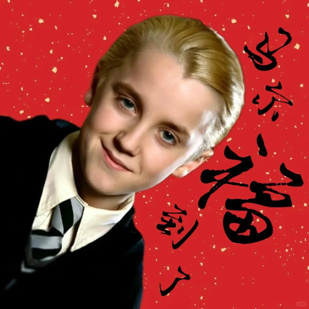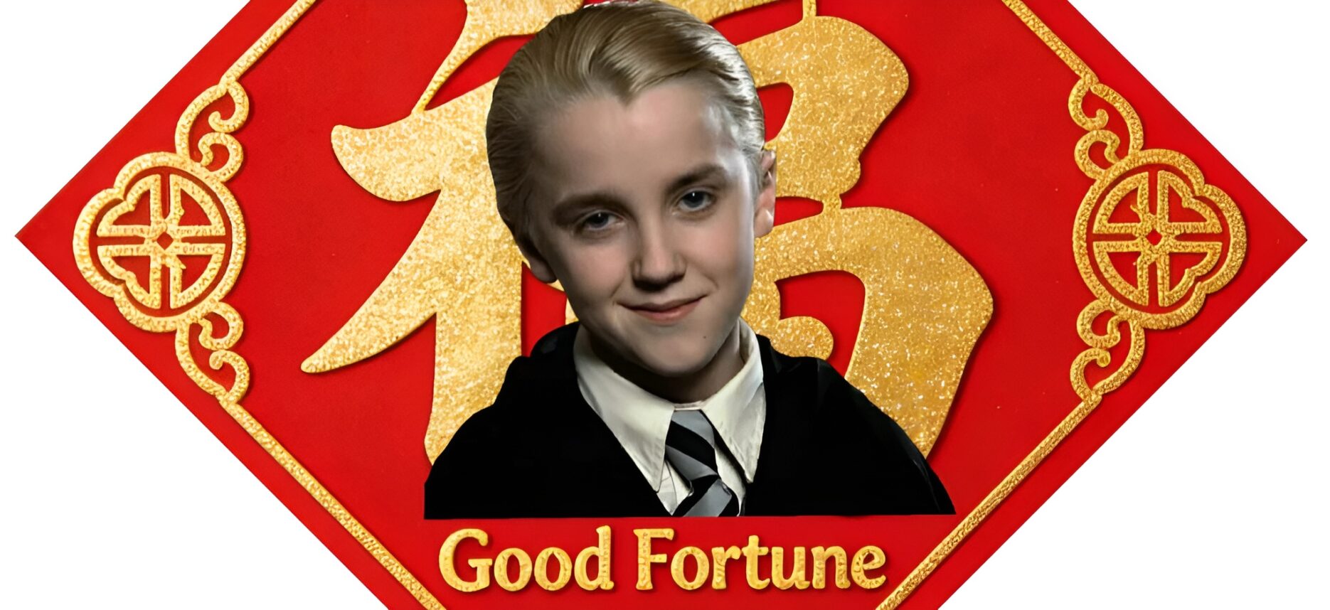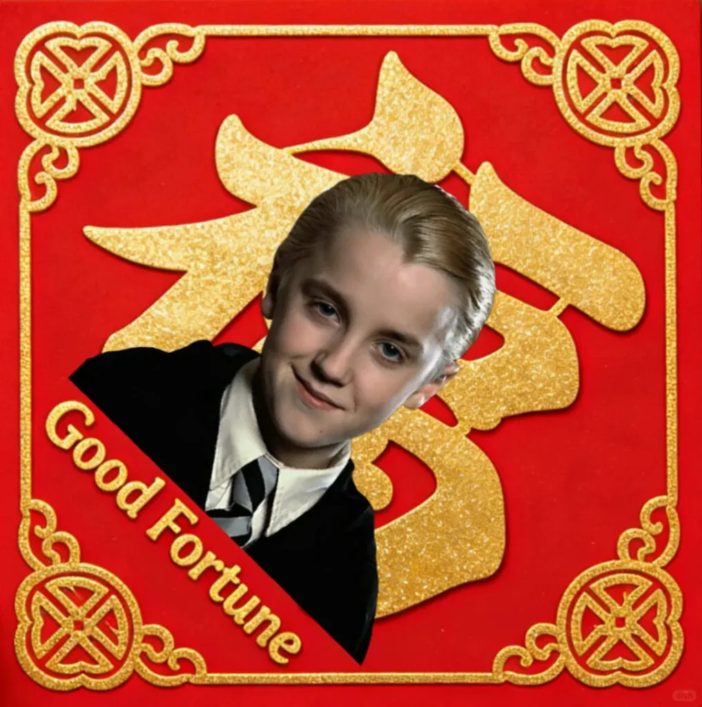 2026 marking the start of the year of the horse, this seems all too auspicious. Now Draco Malfoy is being slapped across traditional Chinese New Year decorations. Those decos look like red diamonds inked with the character fu (福). They’re stuck on people’s front doors to bring fortune to the household in the year to come – often upside down as the word ‘upside down’ sounds a lot like the word ‘arrive’ in Chinese.