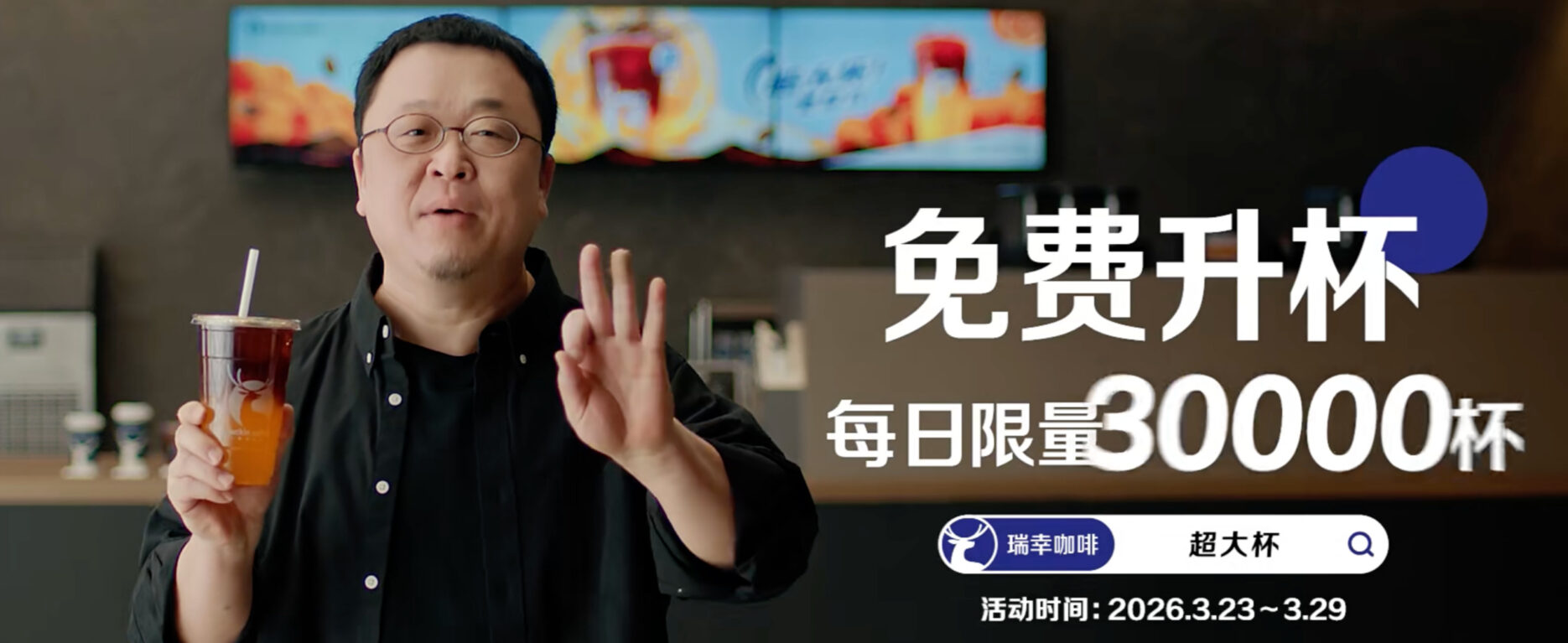 The Luckin Luo Yonghao campaign is backed by a week-long promotion. From March 23 to 29, Luckin is handing out 30,000 free upsizing vouchers daily through its app and mini programme, encouraging users to upgrade large drinks to supersize or extra-large formats.