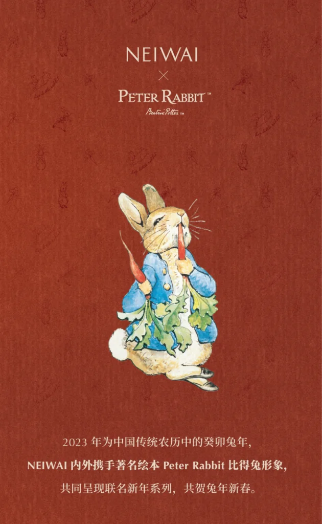 Hopping ahead of China’s fastly approaching year of the rabbit, Chinese intimate apparel brand Neiwai has joined hands with the famous English children’s book Peter Rabbit to present a holiday loungewear capsule collection.