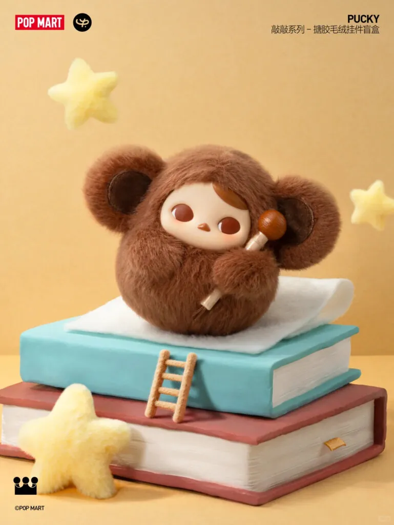 The Chinese toymaker’s latest blind-box release, Pucky Knock Knock, takes inspiration from muyu, a traditional Buddhist percussion instrument used to keep rhythm during sutra chanting. Launched in January at RMB 99 (US$14) per box, the plush keychain series blends spiritual symbolism with tactile play: pull out the tiny drumstick, tap the character’s head, and it emits the familiar electronic tok of a muyu (木鱼).
