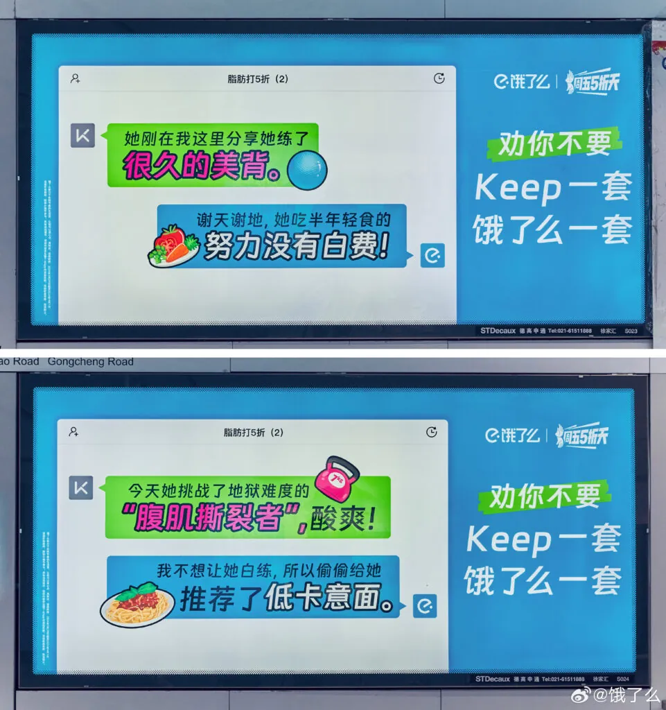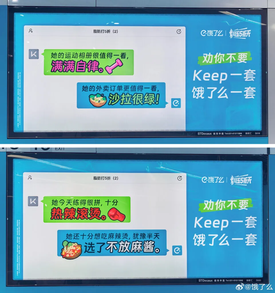 The campaign includes a fictional but relatable chat history between the two apps, discussing a hypothetic person (which is “literally me” for many commuters) who nearly gave up their fitness efforts by ordering a hearty meal or keeping up by ordering low-calorie dishes from Ele.me. It also introduces 50% off on healthy food on Fridays. In addition to the metro station, the ads can also be found at bus stops and shopping centres near major gym branches for people to see after workouts.