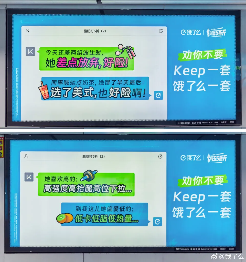 When spring arrived in March, it was time for people to start their fitness plans. Ele.me’s campaign taps into the struggle between controlling diet for fitness and the temptation of takeaways with its joint campaign with Keep. Like the CNY campaign, the billboards are filled with quotes, under the banner of the main slogan “Don’t be two-faced on Ele.me and Keep” (劝你不要Keep一套,饿了么一套). On Weibo, China’s Twitter-like platform, the topic reached 140 million views.